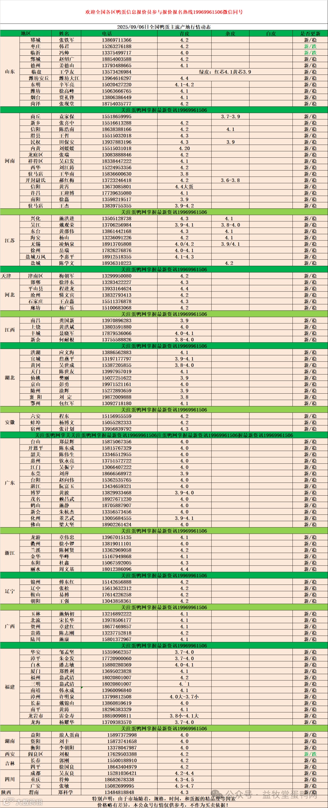 9月06日:初产至10个头2.7元,10个头至8个头3.4元,8个头至7.5个头3.7元,7.5个至大蛋4.2元。