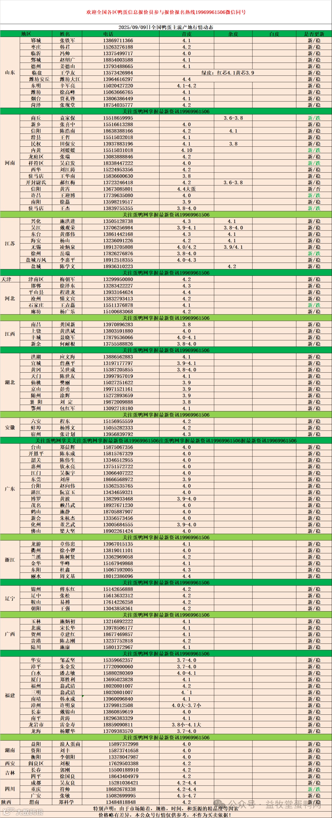9月09日:初产至10个头2.7元,10个头至8个头3.4元,8个头至7.5个头3.7元,7.5个至大蛋4.2元。