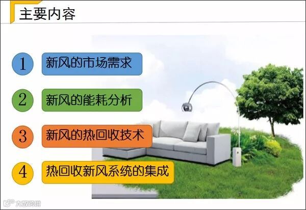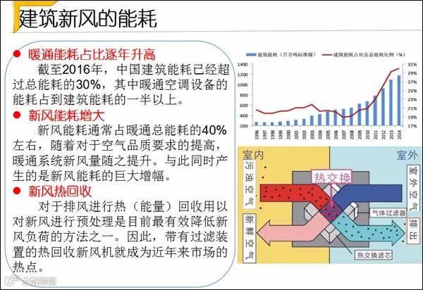 我主要从四个方面简单介绍一下新风热回收,在座的肯定来自厂家的、工程企业居多,也是厂家、工程企业最早开始做热回收。实际上,新风热回收应该说也是一种未来的趋势。我们现在的绿色建筑的被动节能,以前从50%提高到65%,现在提到75%,建筑对这个气密性要求越来越高。那么再通过传统的通风方式是比较难满足要求,那么更多的还在通过空调系统里面,而且在建筑的基础符合本地的情况下。在我们传统的建筑里面,新风系统的暖通负荷大概占到30%~40%。那么在我们未来的建筑里面占到了70%左右。确实是这样,我们对于环境的变化,对新风系统提出了更多的要求。各个地方都出台了,不管国家标准还是地方标准,都出台了标准要求在建筑里面加装通风系统。