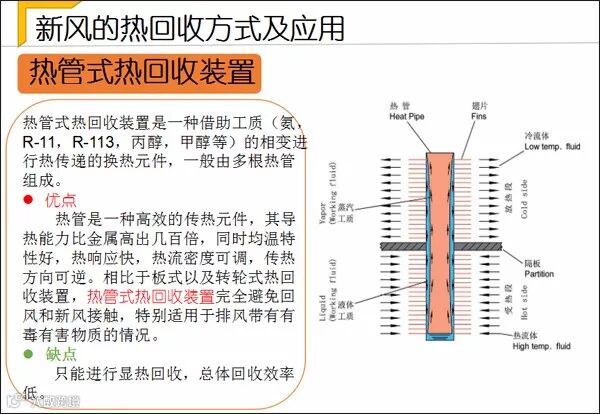 热回收装置主要也有很多种显热的回收设备,还有我们的热管热回收,在国内也有。但是现在看家居这块产品更多还是用的板式的,像热管式热回收,这在一些建筑里面也有使用,它可以实现两端窜气,这个是有效的格局。热管本身在航天领域应用比较多,是一种高效的传统装置,就说热管式的热回收它也是适合于有毒有害物质的情况进行总结。热管热回收这块也有做成两个方式,他们肯定做这个热管式的热回收。热管这个主要是在苏州一代工厂,开发热管的热回收装置。那么现在工程上面在中间热回收,实际上从里面传,再两侧通过液体来进行热回收,这种项目用量是非常大的。很多是香港的事务所他们做的一些设计特别多,而且产值做的也非常大,但是他的热回收效率实际上是非常低的。因为他是通过一个液体中间来进行连接的,而在医院、大型商场非常多。它热回收的效率是比较低的。