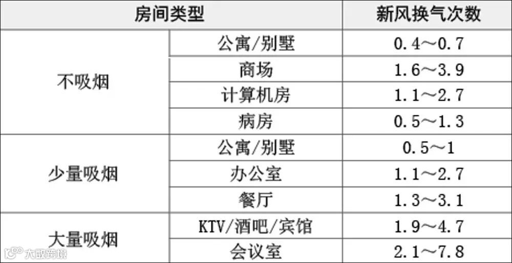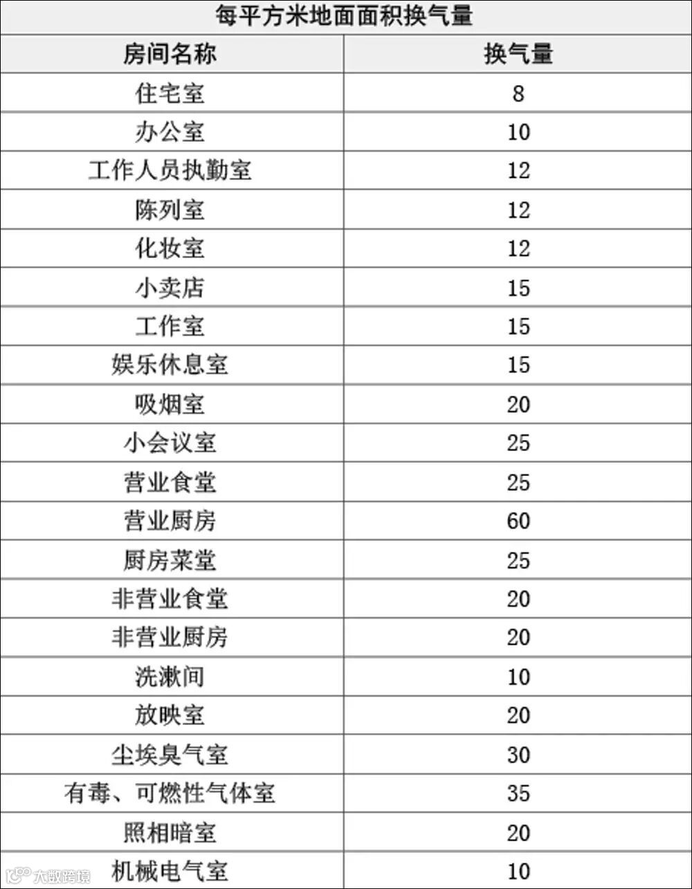 除了上面那种计算方法,还有另一种方法,就是按平方米面积换气量计算,每平方米地面面积换气量[m³/(h·m²)],如表: