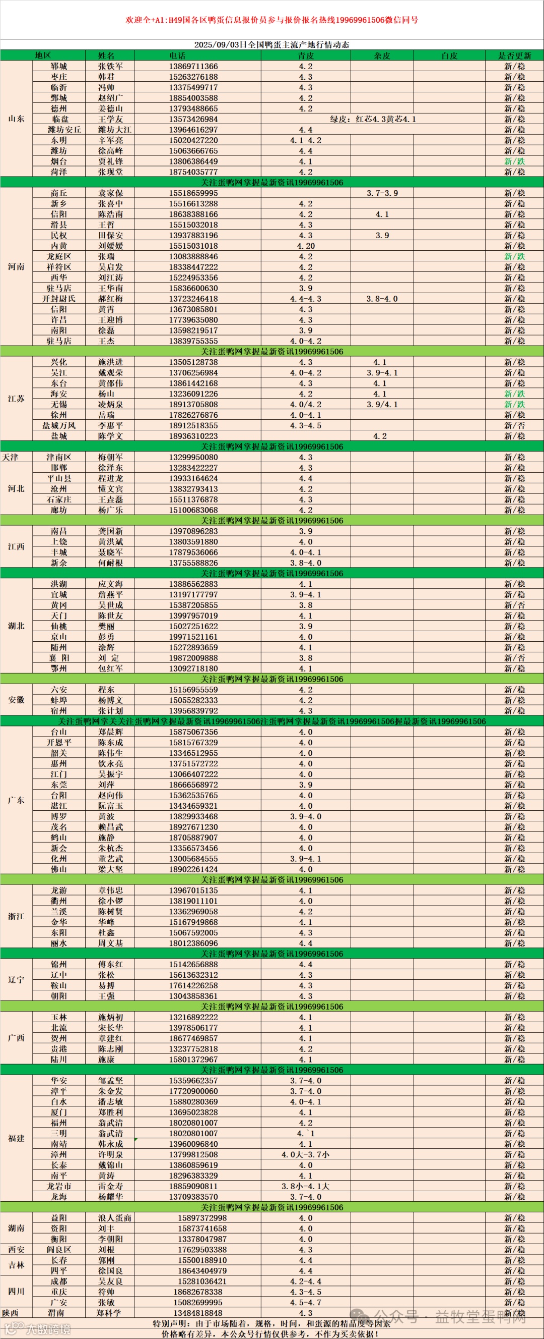 9月03日:初产至10个头2.7元,10个头至8个头3.5元,8个头至7.5个头3.9元,7.5个至大蛋4.4元。