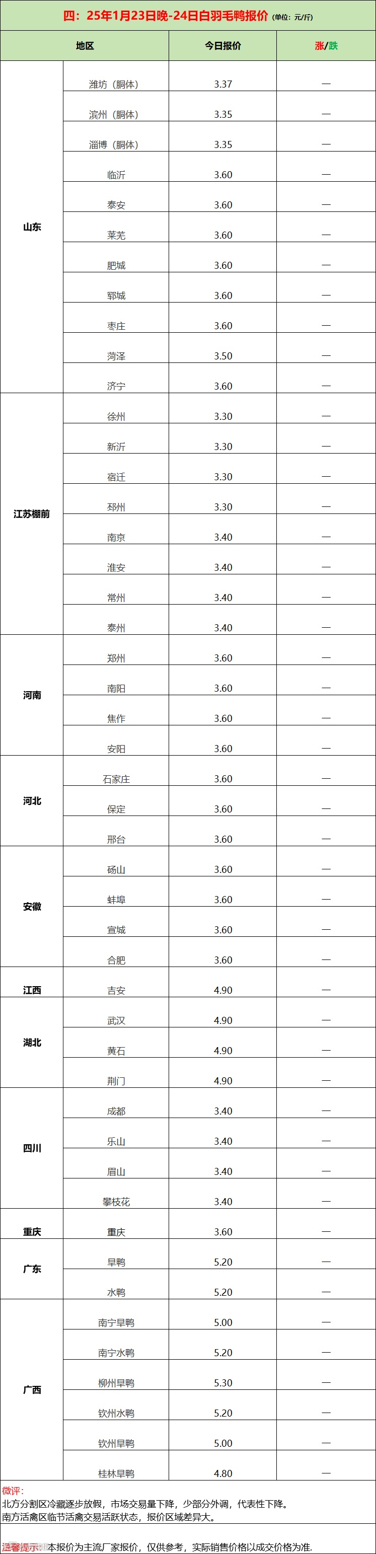 鸭苗报涨,局部低走!产品活禽临节乱价!!--2025年1月24日水禽行情简报