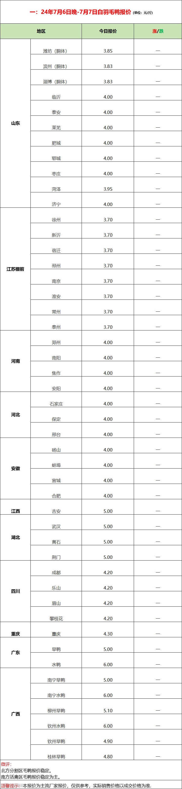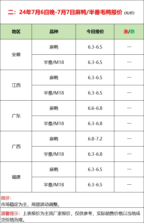 压力加大,鸭苗连续报稳;市场平淡,产品走货一般;--2024年7月7日水禽行情简报