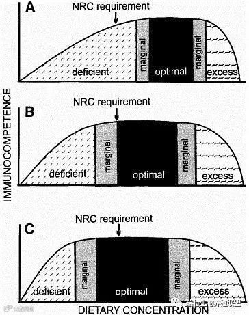 原注:Dietary requirements set by the National Research Council (NRC) are usually based on concentrations that maximize growth and reproduction and prevent known deficiency pathologies. Optimal immunocompetence may occur at nutrient levels that are: higher than the NRC requirement (panel A); equal to the NRC requirement (panel B); or less than the NRC requirement (panel C).