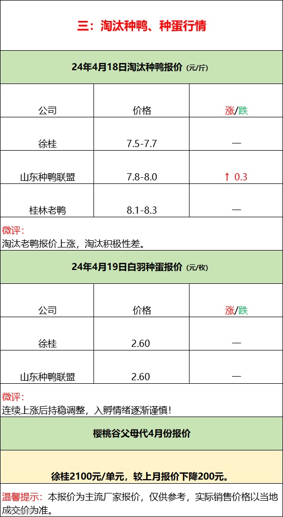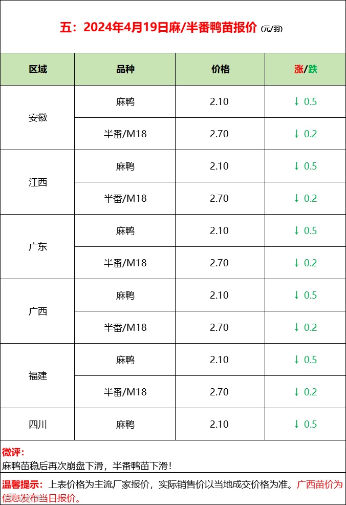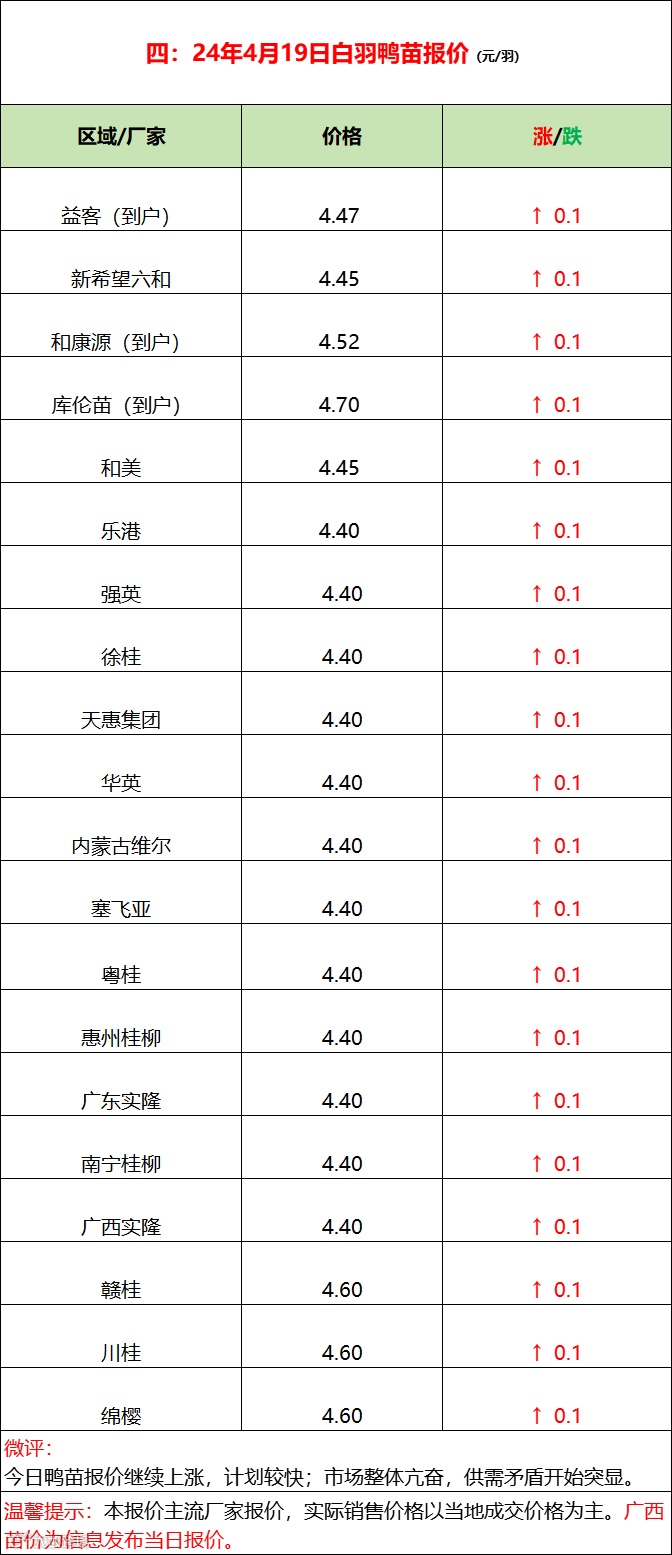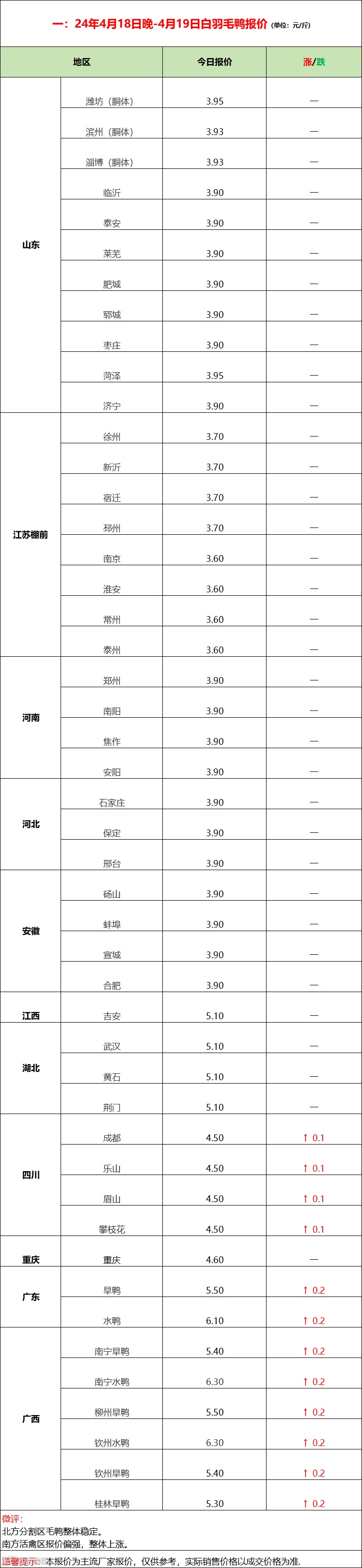 今日北方毛鸭基本持稳,南方水旱鸭配合鸭苗持续拉涨。产品端走货平稳,报价整体稳定,副产品局部走强,厂家拉涨情绪上升,市场库存经历一轮补货相较充裕,消费端表现一般。