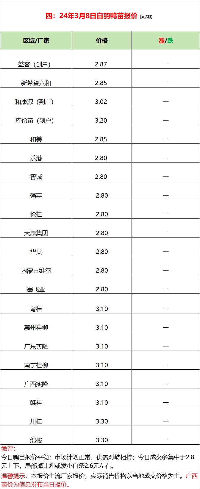 各联盟企业大家好,2024年1、2月份我们行业迎来了一个难得的小阳春,暂时给了我们一个喘息的机会;但是受制于极度低迷的消费形势的影响,2月下旬开始,行情急转直下,鸭苗价格从5.2元的高点,迅速回落至3元以内保本线附近。