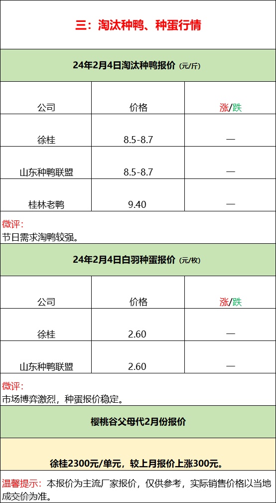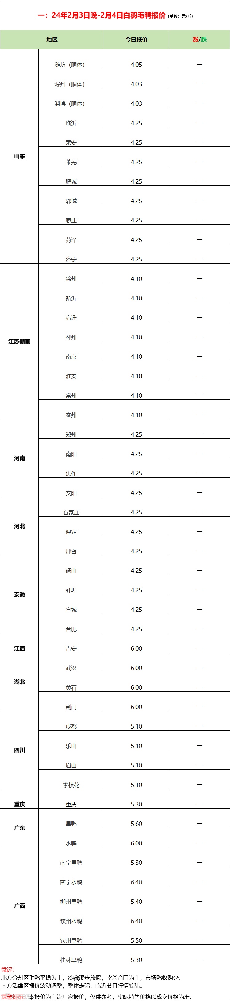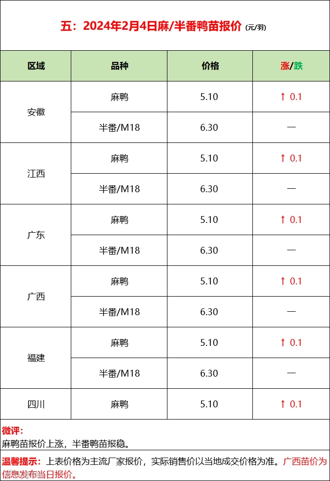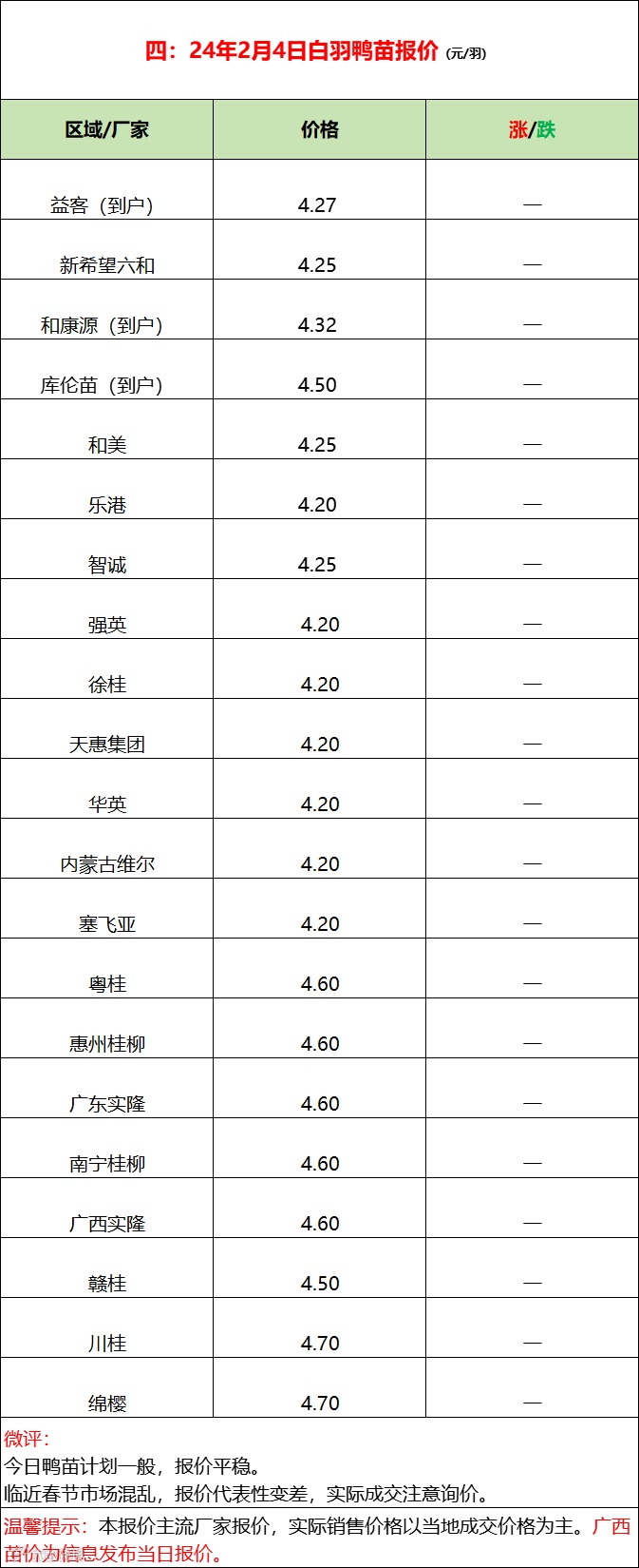 今日鸭苗计划一般,报价平稳。临近春节市场混乱,报价代表性变差,实际成交注意当地询价。