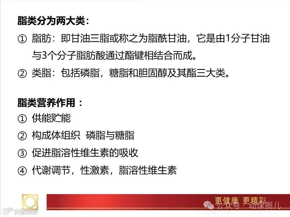 脂肪是构成肌体必需成分。如生殖细胞中的线粒体,神经组织中含有大量的卵磷脂和脑磷脂,血液中含有各种脂肪,皮肤和被毛中含有大量的中性脂肪、磷脂、胆固醇等。