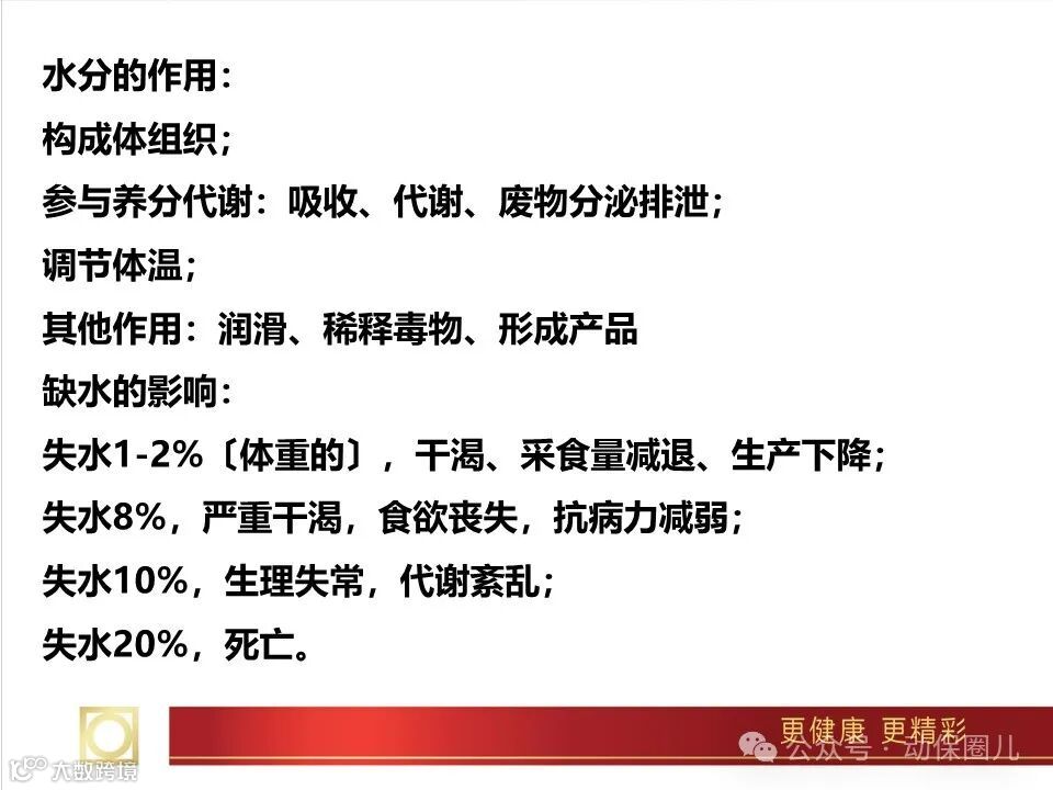 水是机体多种物质的溶剂。大多数营养物质必须溶于水后才能被肌体吸收和利用。同时,狍生命活动过程中所产生的代谢废物,也只有溶于水并通过水溶液的形式排出体外。水可以直接参与肌体中各种生物化学反应,可调节体温。水存在于各种组织细胞中,使细胞保持一定形状、硬度和弹性。水能润滑组织,减缓各脏器之间的摩擦和冲击等。人工养狍必须保证供给充足、洁净的饮水。