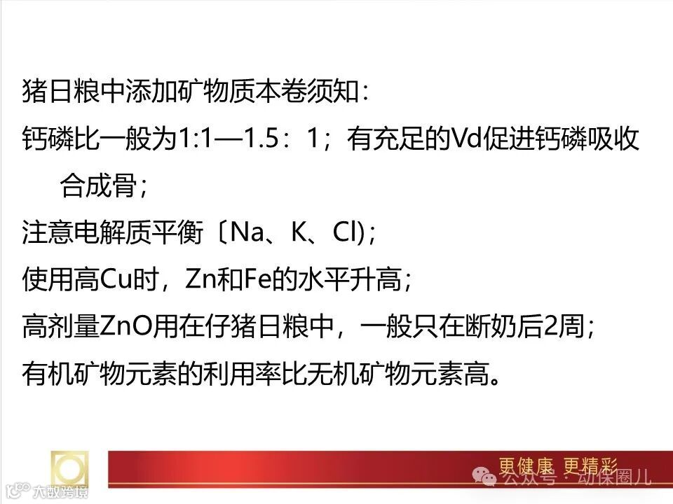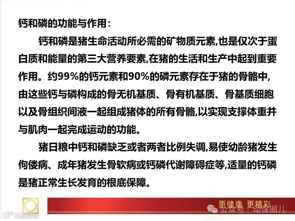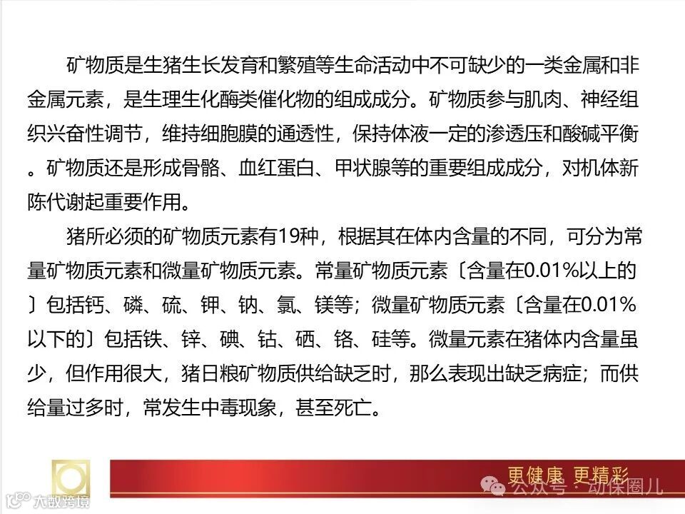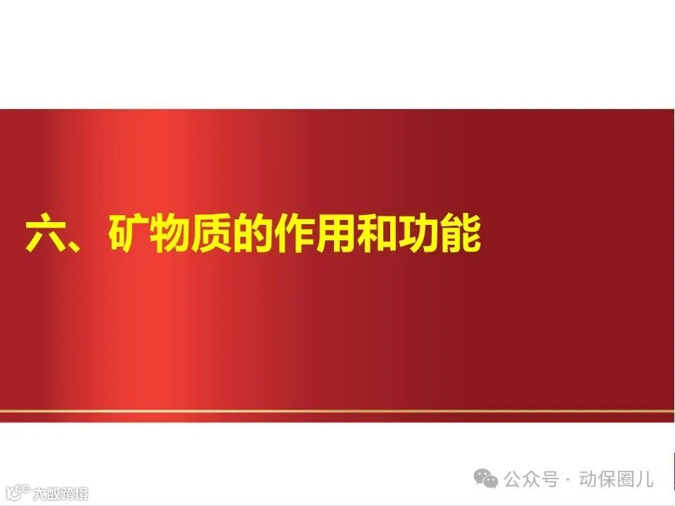 虽然矿物质在狍体内含量较少(3%~5%),但它有着很重要的营养和生理意义。矿物质是肌体细胞的组成成分,直接或间接地参与细胞、组织和器官的各种生理活动,如生长、发育、分泌、繁殖、代谢调控等;矿物质对维持肌体组织功能,特别是对神经和肌肉组织的正常兴奋性有极重要的作用;矿物质也参与食物的消化和吸收过程,如胃液中的盐酸及胆汁中的碱性钠盐等,对各种营养物质的消化吸收都是必需的;矿物质还在维持水的代谢平衡、酸碱平衡、调节血液正常渗透压等方面,有很重要的生理作用。在营养学上所说的矿物质(亦称为无机盐)实际上是指动物肌体所必需的常量元素和微量元素所形成的无机盐类。几种主要元素的作用如下。