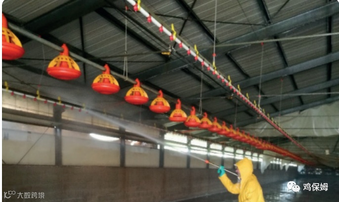消毒应从顶部到两侧,然后是鸡舍底部,从鸡舍后部到鸡舍前部。大多数消毒剂溶解在水中并持续接触,直到所用溶液变干。发泡消毒剂可以增加消毒剂的接触时间,因为它需要更长的干燥时间,从而延长消毒剂的抗菌活性。正确使用消毒剂可减少约 90% 的微生物负荷。 -