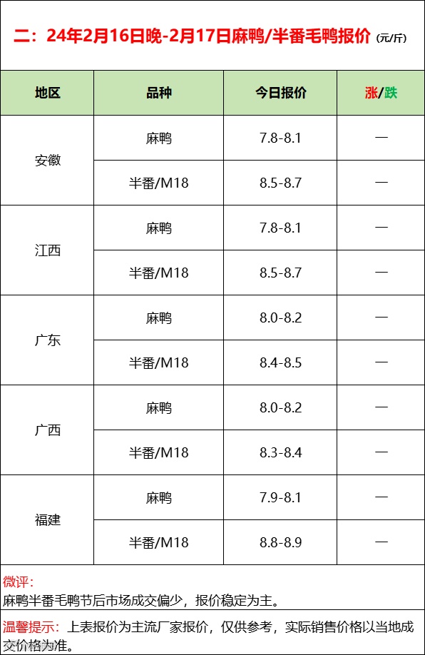 毛鸭整体节后成交较少,报价逐步恢复中。