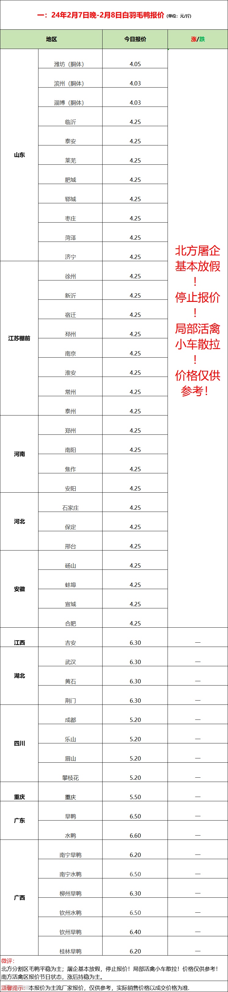 北方屠宰企业基本放假,报价暂停,局部市场小车拉货,报价不稳,仅供参考!