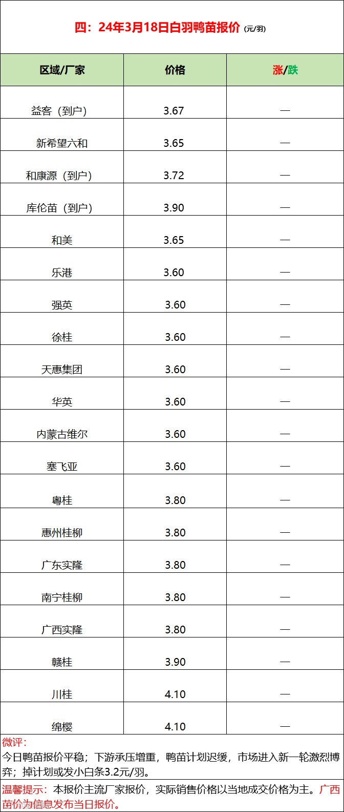 今日鸭苗涨后平稳;连续推涨后下游承压,市场争夺趋于激烈;今日鸭苗计划较慢。