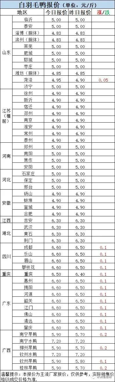 南方活禽区域报价上涨主导,毛鸭陆续上调。