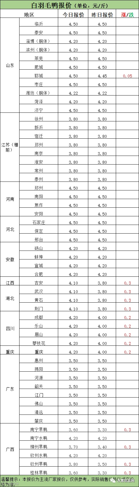 北方市场毛鸭报价恢复性上涨;冷藏恢复开工中,市场缓和迹象。南方活禽区域报价波动上扬,压抑后旱鸭报涨。