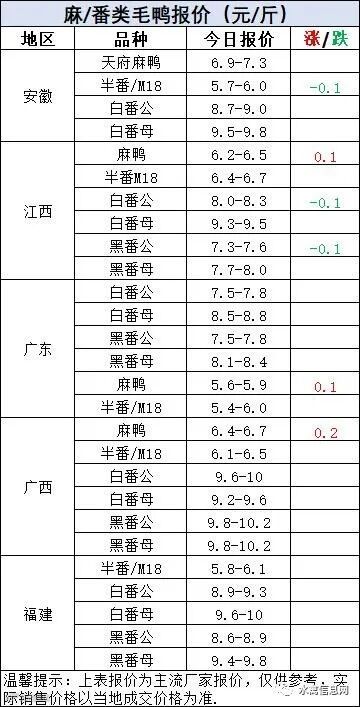 麻鸭苗报价下滑0.3元/羽,半番鸭苗报价大跌0.5元/羽。