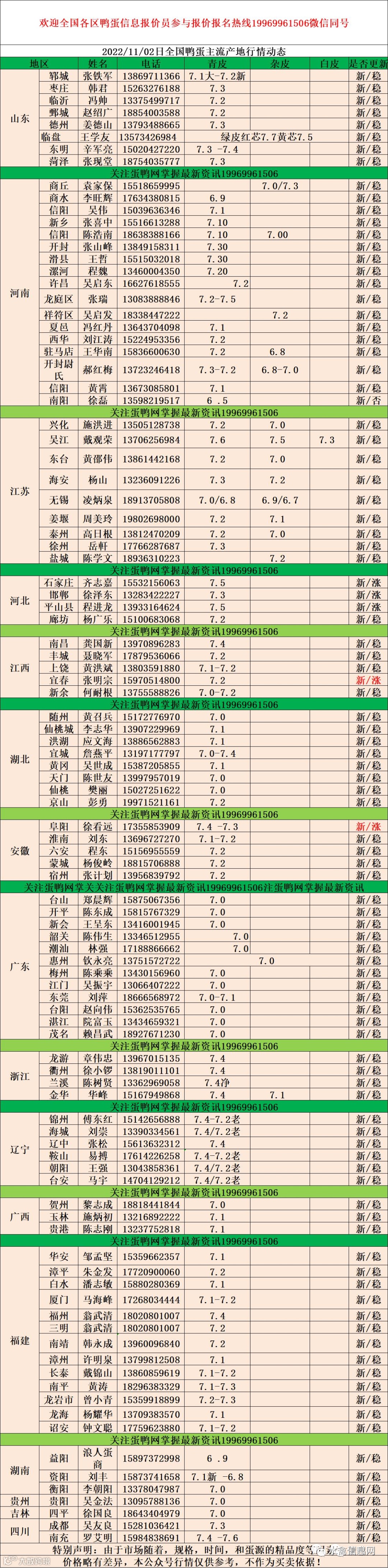 2022年11月02日:老鸭蛋7.2元,初产至10个头7元,10个头至大蛋7.4元。