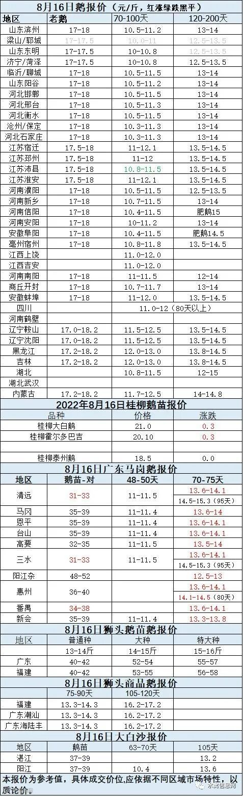 2022年8月16日鹅种蛋价格(元/枚)部分停报