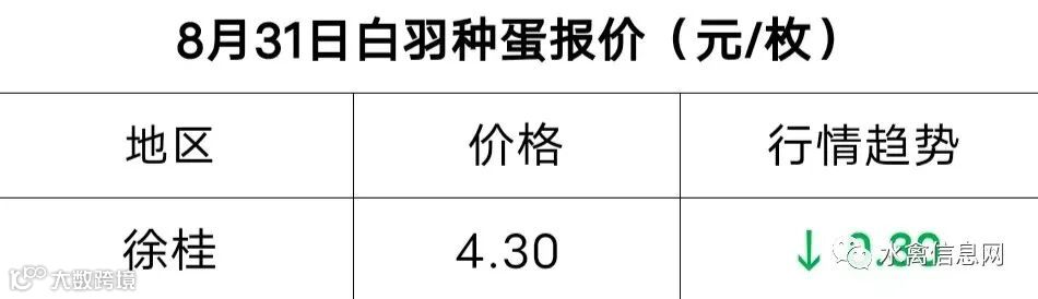8月31日种蛋报价4.3元/枚,较30日价格下跌0.3元/枚;