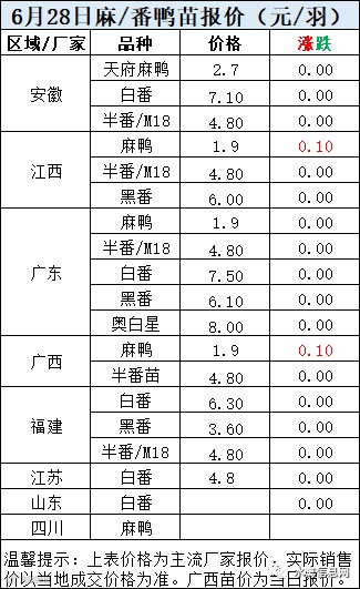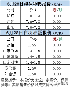 一、6月27日晚至6月28日 白羽肉鸭报价