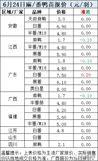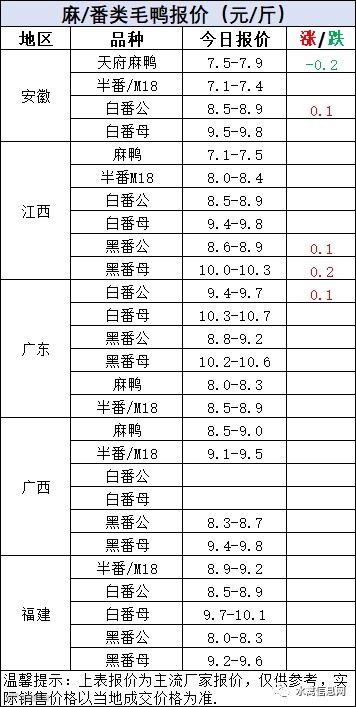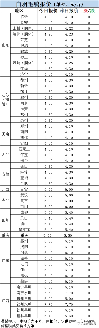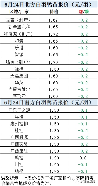 鸭苗报价全线走弱,明日北方鸭苗下滑0.2元/羽。南方鸭苗下滑0.1-0.2元/羽。