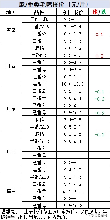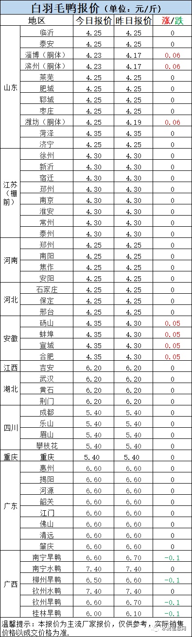 明天鸭苗,北涨南稳,弱势调整;北方鸭苗持续反弹上涨0.2元/羽。南方鸭苗弱稳调整。