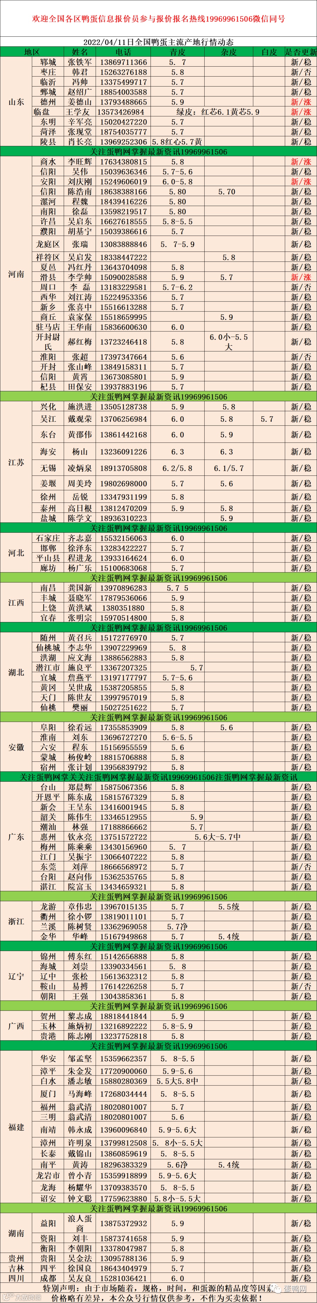 2022年04月11日鲜鸭蛋价格:初产至10个头5.4元,10个头至9个5.6元,9个头至大蛋5.8元(鸭蛋价格仅供参考)。