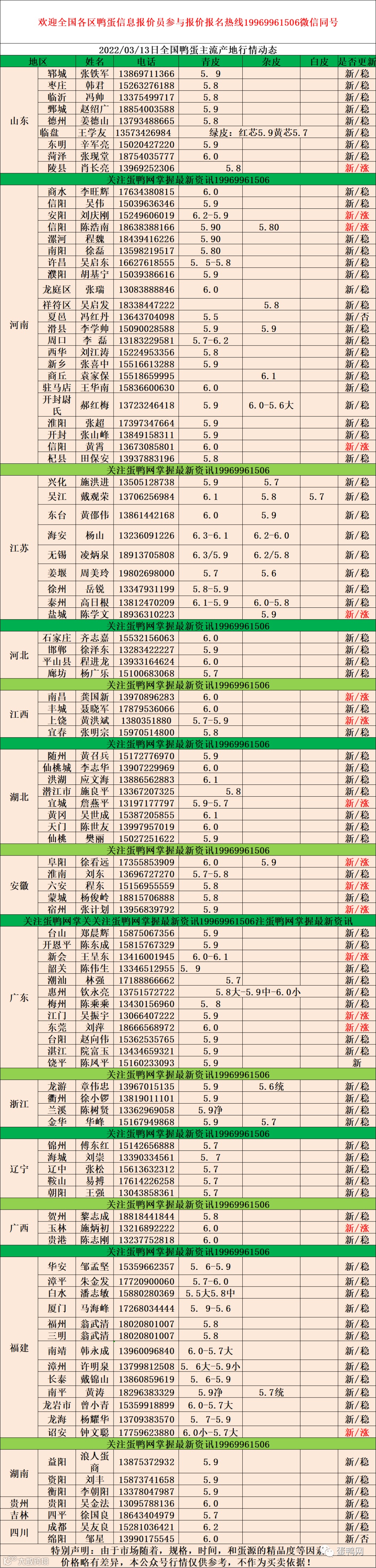 2022年03月13日鲜鸭蛋价格:初产至10个头5.3元 。 10个头至9个5.5元。9个头至大蛋5.7元(鸭蛋价格仅供参考)。
