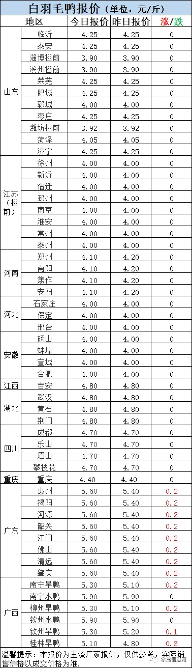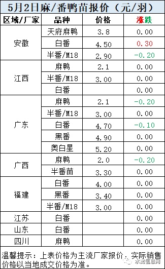 明日鸭苗报价弱稳为主,北方报稳调整,南方鸭苗全面反弹试涨0.1元/羽。五一假期,合同投放略有收紧,鸭苗盘稳蓄势。受疫情影响运输困难,鸭苗到户运价普遍上涨。当前鸭苗疫情影响下,供需两端撕裂,博弈加剧。