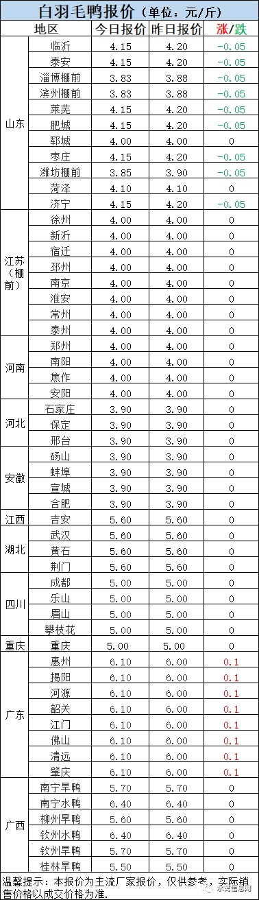 明日鸭苗报价整体全线下滑。合同利润过低叠加疫情影响,合同区与市场区养殖端补栏积极性就不高。天气渐日补栏量自然下滑,影响最严重的还是疫情。当前全链条利润空间较低,供需博弈激烈。疫情影响下,市场成交价较乱,注意询价。