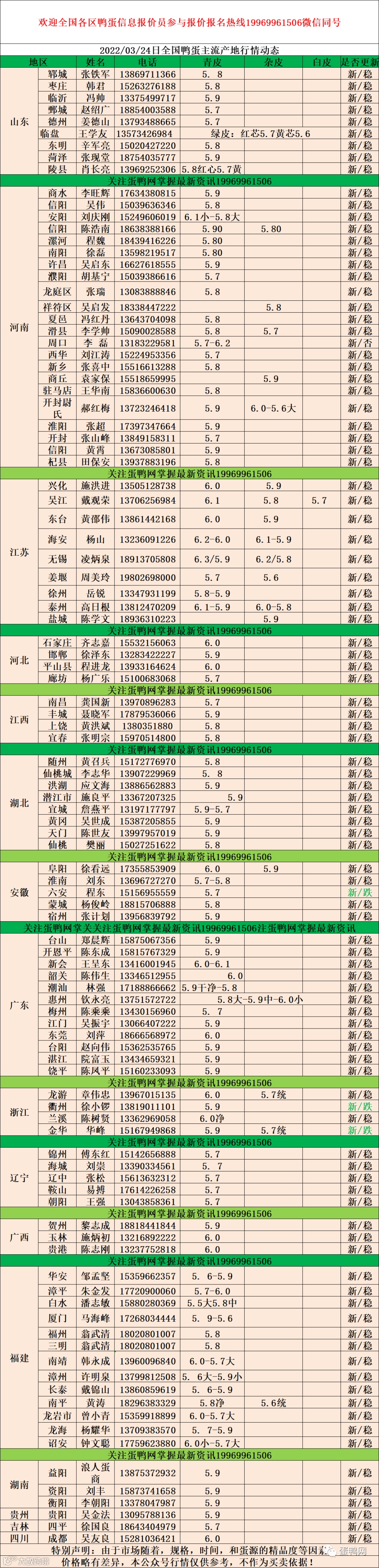 2022年03月24日鲜鸭蛋价格:初产至10个头5.3元 。 10个头至9个5.5元。9个头至大蛋5.7元(鸭蛋价格仅供参考)。