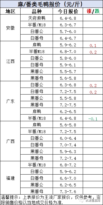 麻鸭苗报价上涨0.2元/羽。半番鸭苗报价走弱。主产区疫情封控渐严,实际成交较乱,局部高报低走,注意询价。