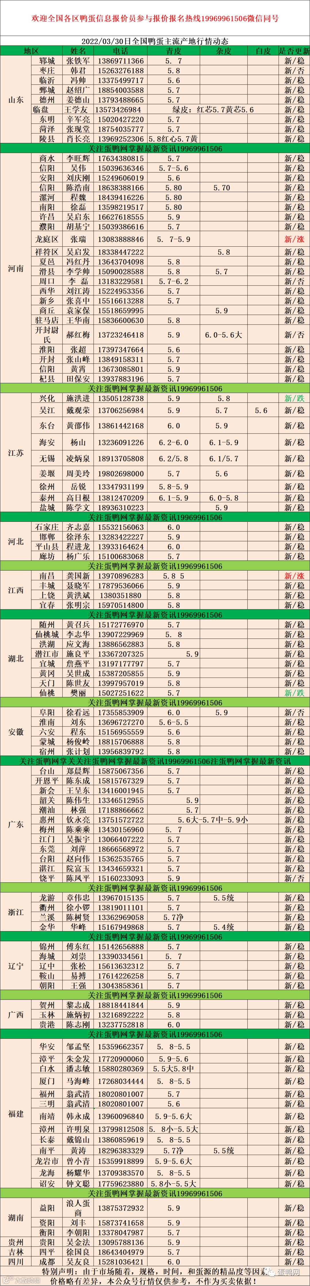 2022年03月30日鲜鸭蛋价格:初产至10个头5.3元 。 10个头至9个5.5元。9个头至大蛋5.7元(鸭蛋价格仅供参考)。