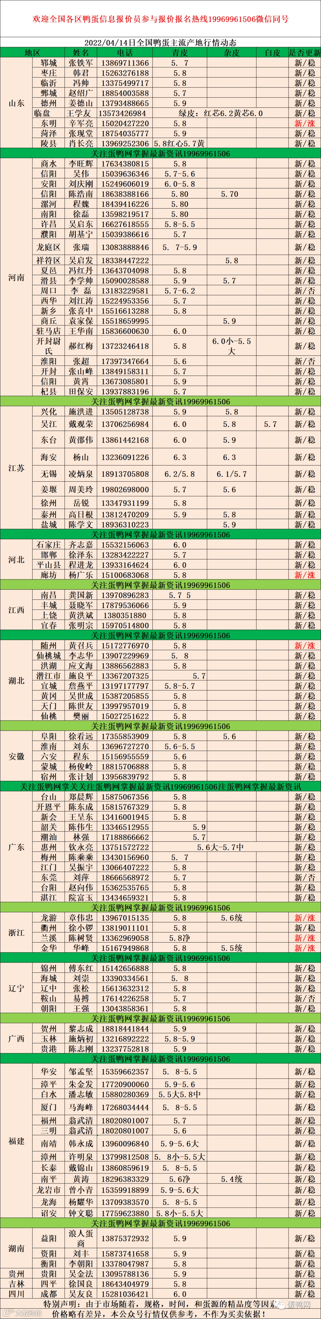 2022年04月14日鲜鸭蛋价格:初产至10个头5.3元,10个头至9个5.5元,9个头至大蛋5.8元(参考值)