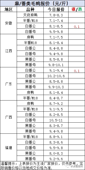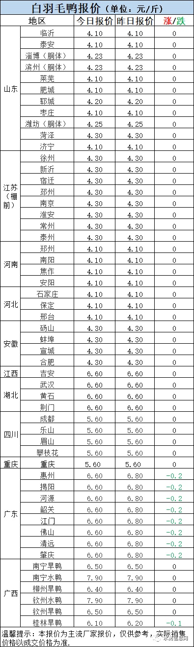 今日南方鸭苗江西下调0.1元/羽,其他区域暂稳。