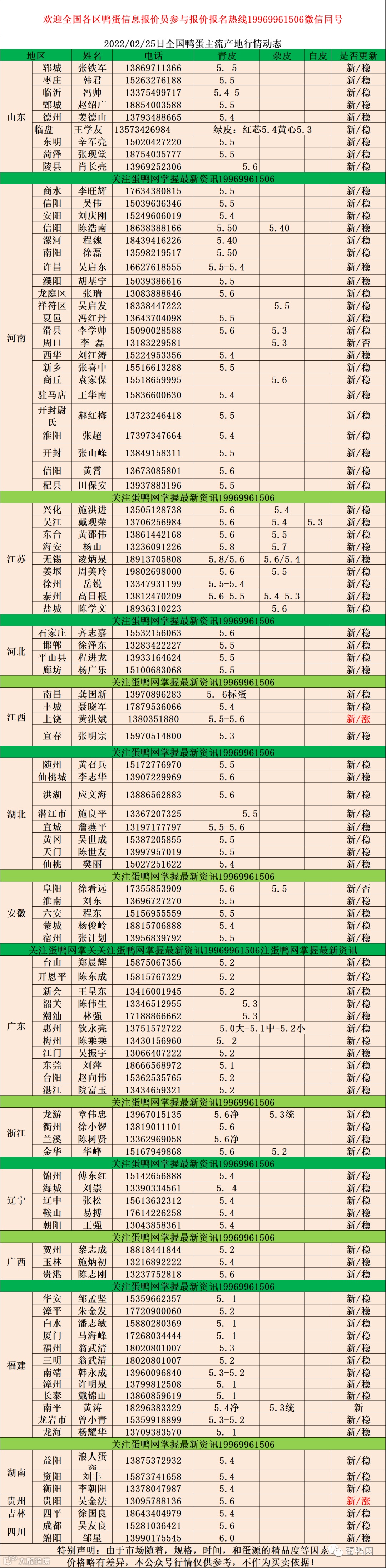2022年02月25日鲜鸭蛋价格:初产至10个头5.0元 。 10个头至9个5.2元。9个头至大蛋5.4元(鸭蛋价格仅供参考)。