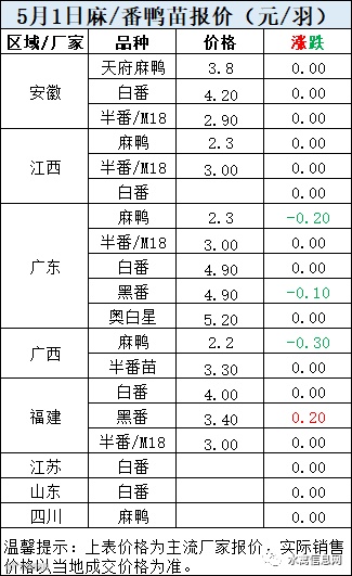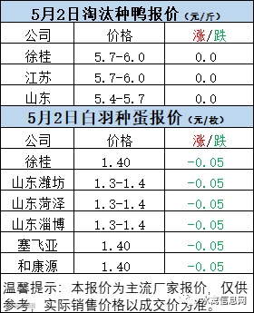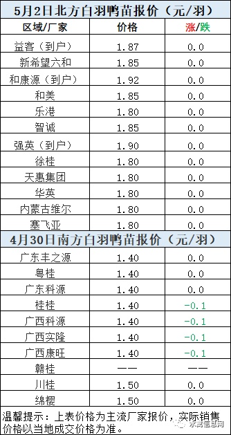 一、5月1日晚至5月2日 白羽肉鸭报价