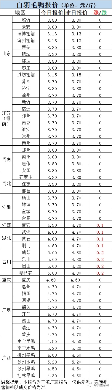 持续反弹,鸭苗报价整体上涨0.2元/羽。疫情影响下,市场成交价较乱,注意询价。当前市场疫情主导,各地区运输情况不一,政策执行情况不一。难度极大。