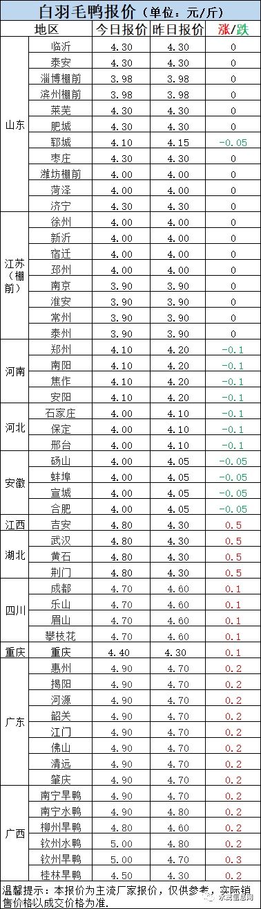 明日鸭苗报价整体上涨0.1元/羽。供需两端博弈加剧。鸭苗上涨压较大。