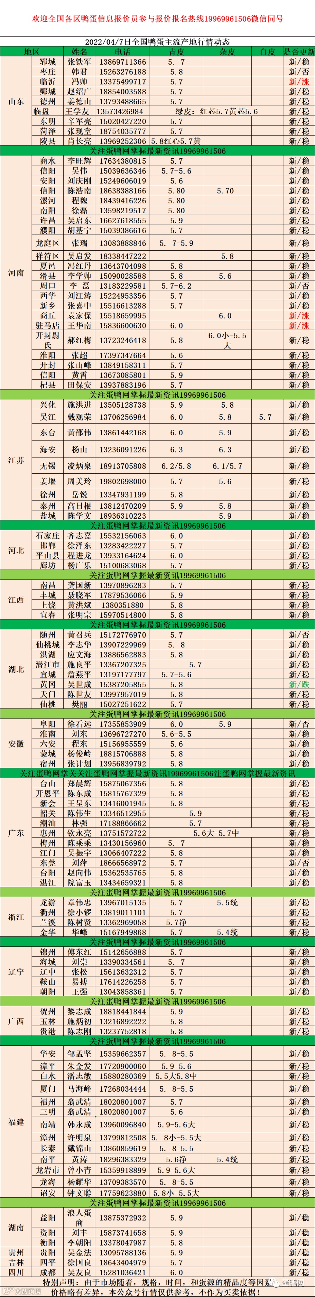 2022年04月7日鲜鸭蛋价格:初产至10个头5.3元 。 10个头至9个5.5元。9个头至大蛋5.7元(鸭蛋价格仅供参考)。