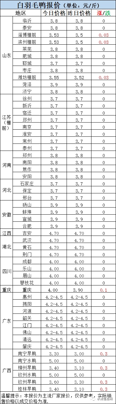 饲料连续上涨,养殖成本上涨,冷藏合同下调,供需两端博弈加剧,今日鸭苗报价跌后持稳。