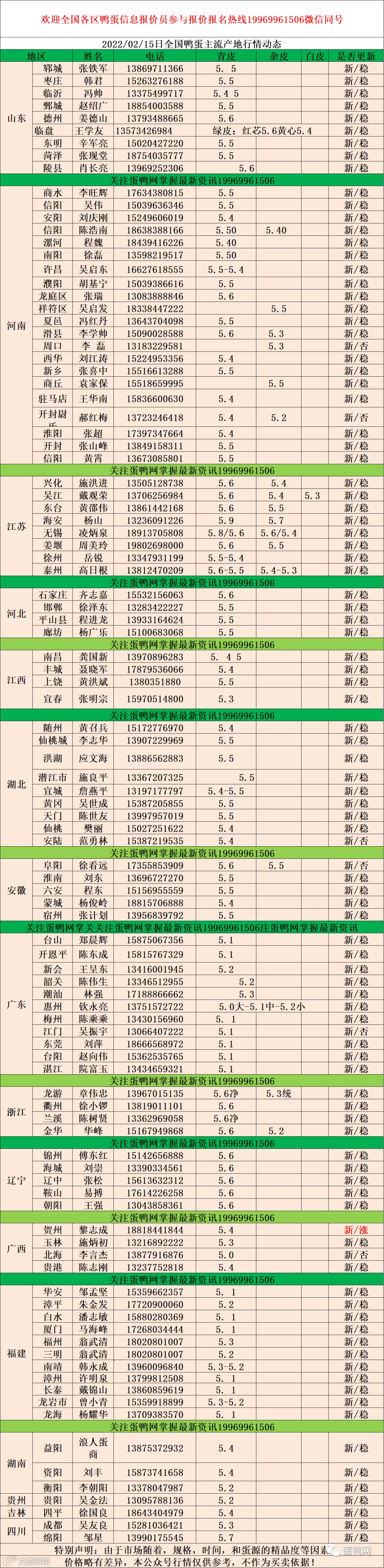 2022年02月15日鲜鸭蛋价格:初产至10个头5.0元 。 10个头至9个5.2元。9个至7个半5.4元。7个半至7个头5.5元,足7个头5.6元(鸭蛋价格仅供参考)。