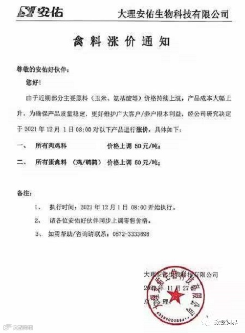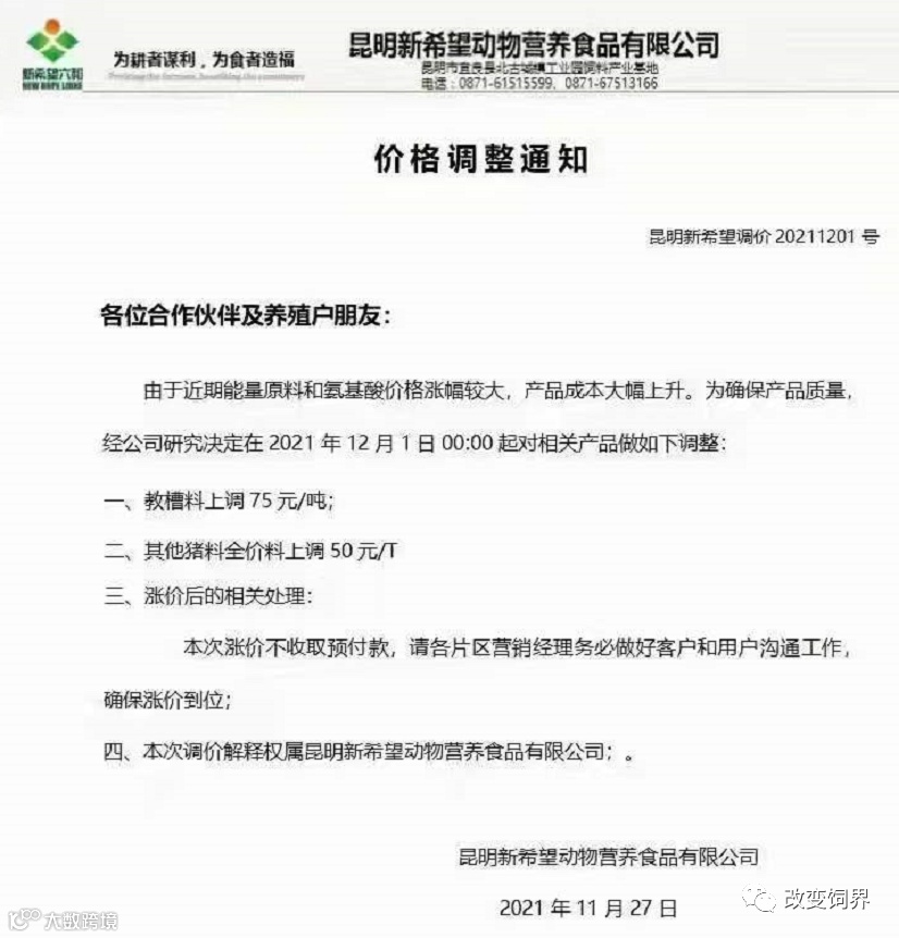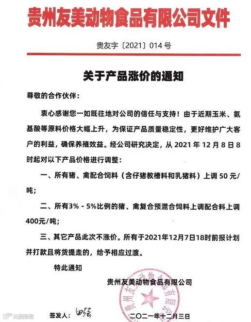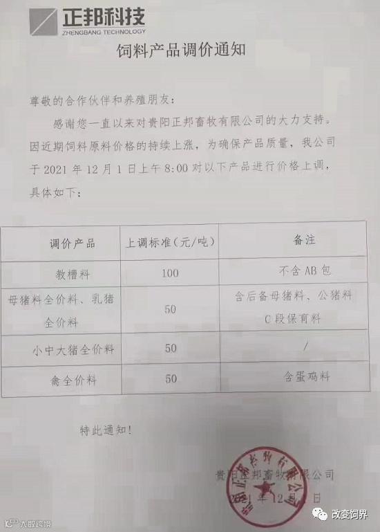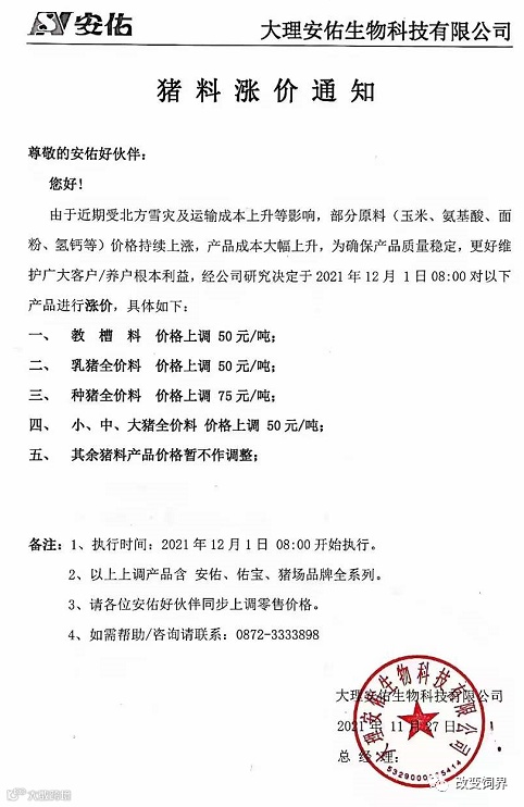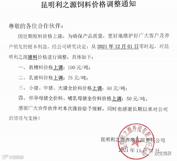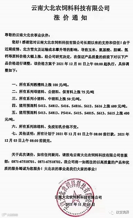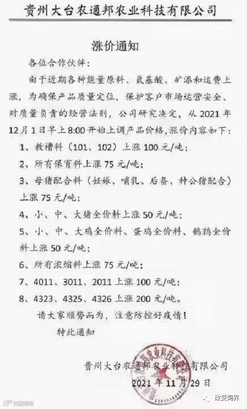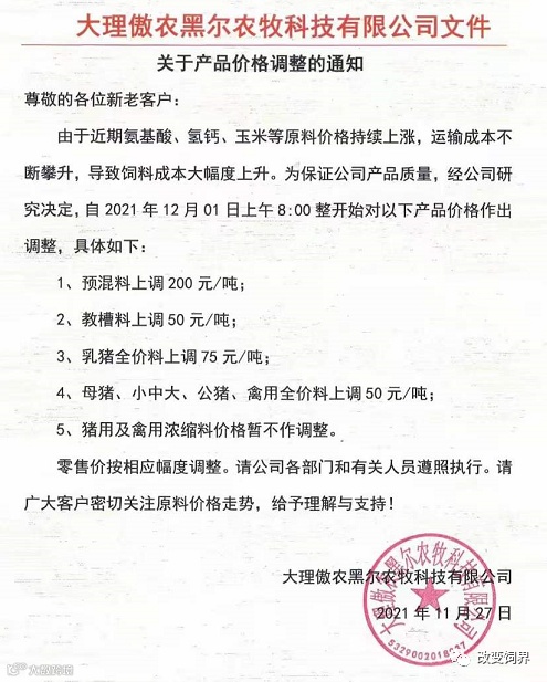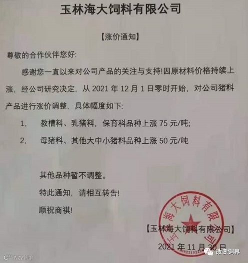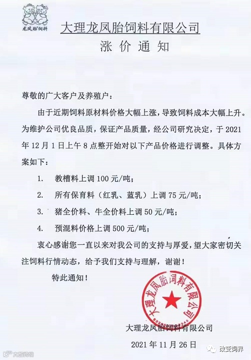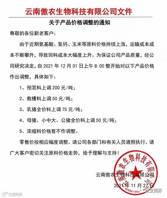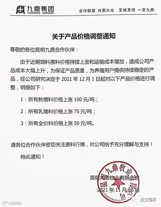 由于豆粕、玉米、麸皮、次粉等大宗原材料价格继续暴涨,为确保民大饲料产品质量,经公司研究决定,从2021年12月7日上午8:00开始,对饲料产品价格做如下调整: