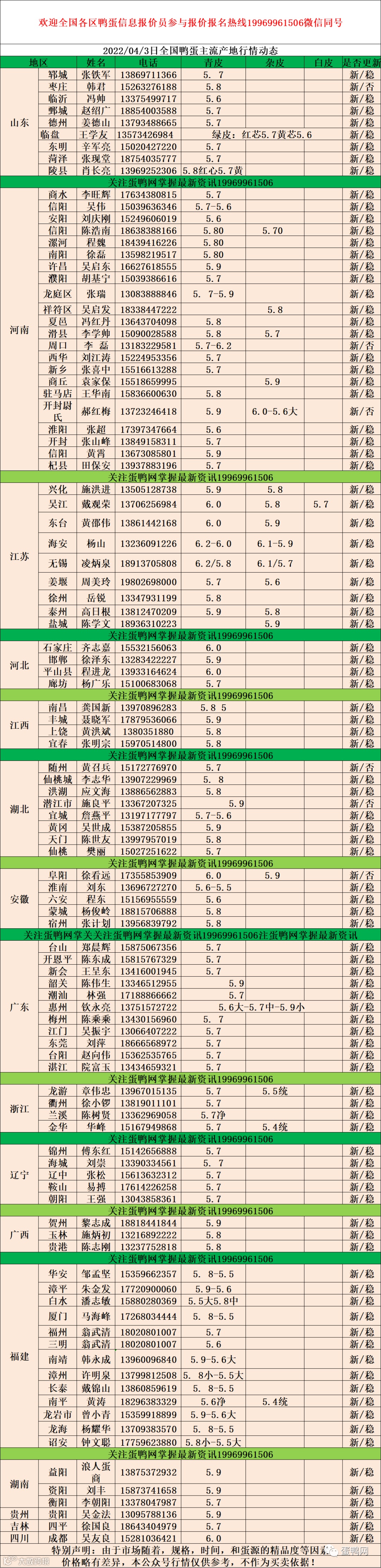 2022年04月3日鲜鸭蛋价格:初产至10个头5.3元 。 10个头至9个5.5元。9个头至大蛋5.7元(鸭蛋价格仅供参考)。