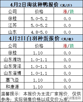 一、4月1日晚至4月2日 白羽肉鸭报价