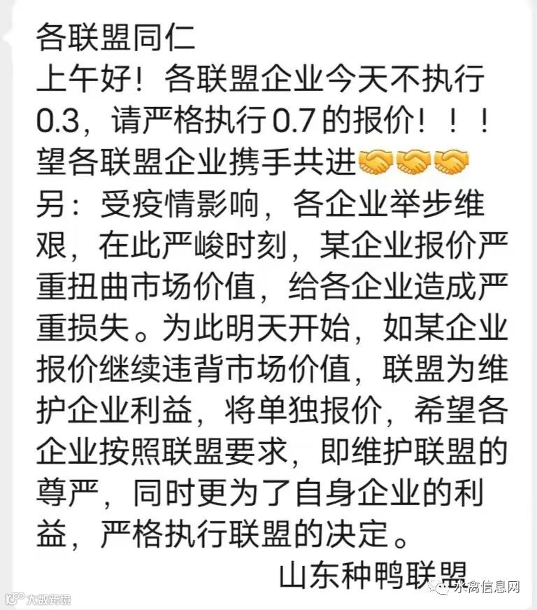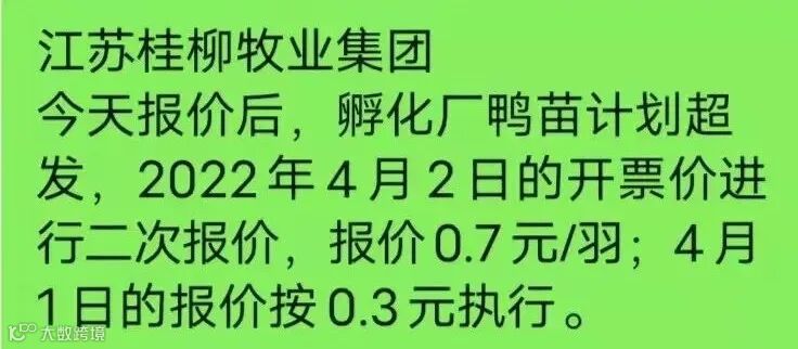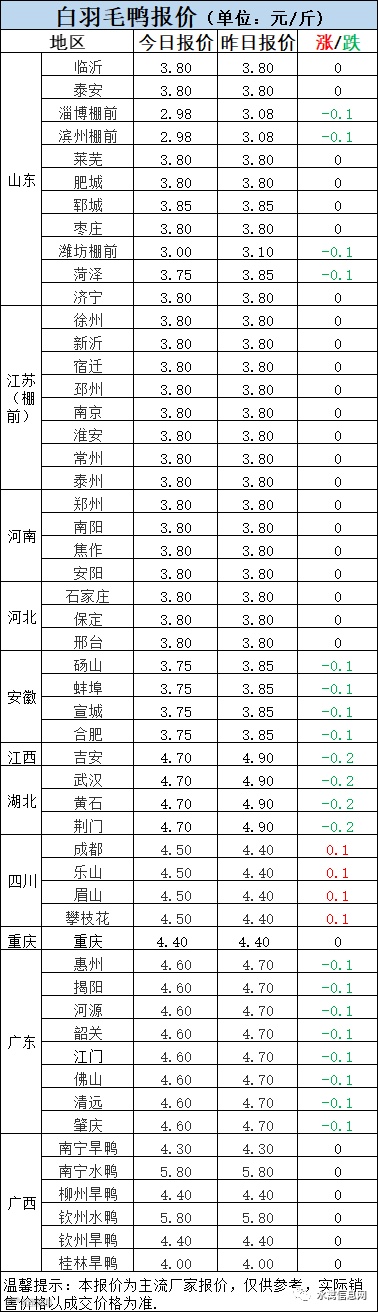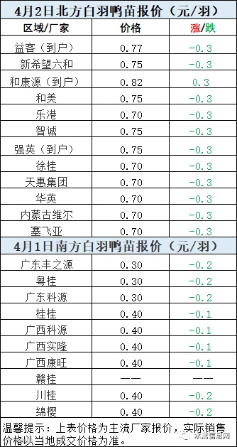 受疫情影响近日北方鸭苗报价较混乱,今日开盘报价大跌至0.3元/羽,随即厂家挺价至0.7元/羽。围绕4月1日苗价又有多番争夺调整。实计成交较也很混合,市场各区域参差不齐,多有高报低走情况发生。建议大家要注意结合当地疫情发展询价。