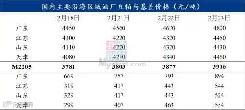 具体看最近4个交易日豆粕期现货价格,以沿海主要区域广东、江苏、山东、天津为例。出现豆粕现货单边价格与基差价格齐飞盛况,怎一“涨”’字了得?豆粕现货价格每个交易日超100元/吨的速度飞奔。据Mysteel农产品数据显示,沿海主要区域2月18-2月22日现货价格由4080-4450元/吨,涨至4430-4800元/吨,累计上涨350元/吨,累计涨幅7.87%-8.58%;现货基差价格由299-699元/吨,涨至524-894元/吨,累计上涨195-225元/吨,累计涨幅2.79-7.53%。