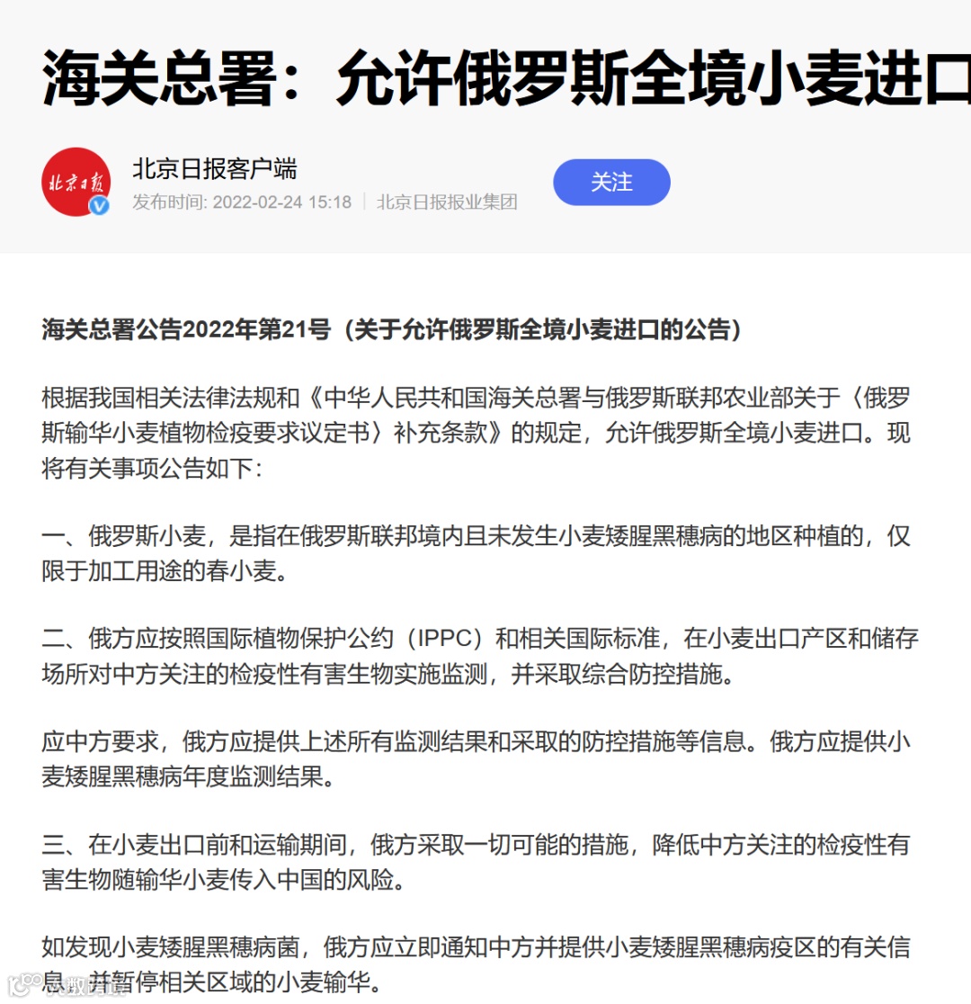 2月24日,中国海关总署发布公告表示,允许俄罗斯全净小麦进口。